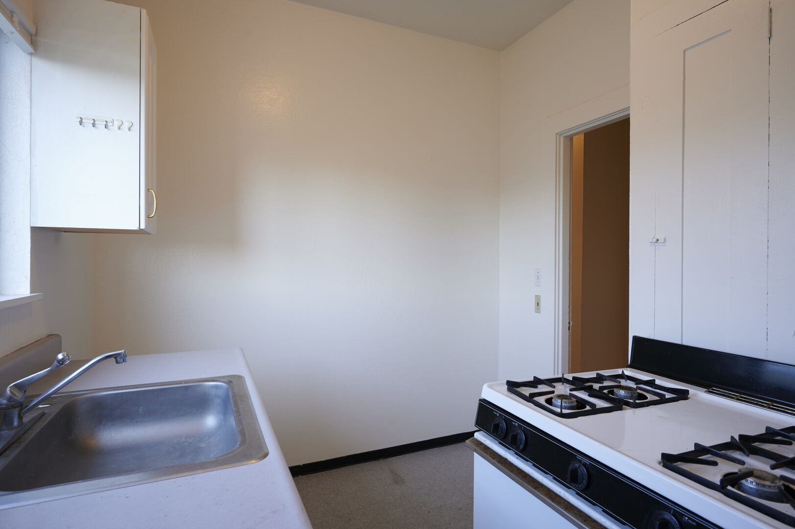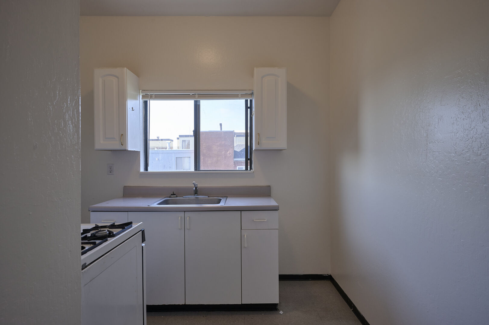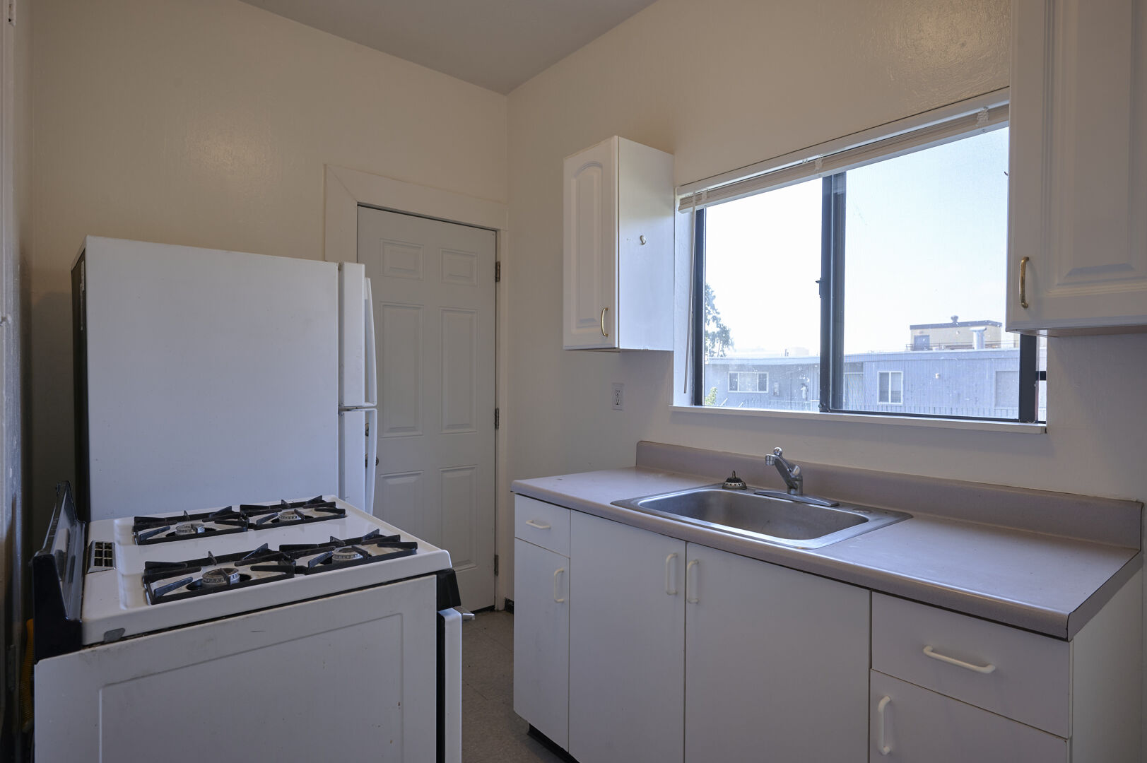 This longer skinnier floor plan has hardwood flooring throughout each room. In this floor plan you can use the living room like a 3rd bedroom or simply use it as an office or den if you prefer. This unit lets in a lot of natural light and makes it shine in in the daytime hours. Bathroom has full tub and shower and kitchen opens out to the back stairs and features gas range.